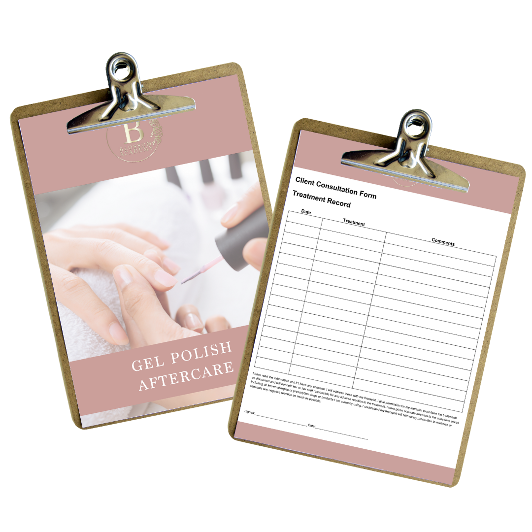 An aftercare poster you can share with your clients so they can make their manicure last as long as possible PLUS our client consultation cards for you to store all the information you need for each client.
